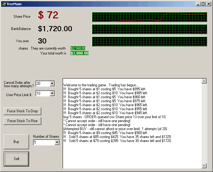 end;procedure TfrmMain.bntBuyClick(Sender: TObject); begin OrderManager.AddOrder(User.myself, strtoint(cbNumShares.text), 'buy', Share.myself); end; procedure TfrmMain.btnSellClick(Sender: TObject); begin OrderManager.AddOrder(User.myself, strtoint(cbNumShares.text), 'sell', Share.myself); end; procedure TfrmMain.Timer1Timer(Sender: TObject);
