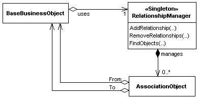Managerss list.The use of a Relationship Manager is a private implementation issue for the classes involved. The Relationship Manager is only accessed by the classes involved in the relationships. The interfaces on your business classes remains the same as your UML design. You end up with the following architecture: