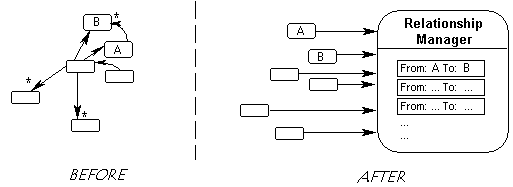For implementing complex, constrained relationships involving more than a couple of classes, a Relationship Object pattern is still a good choice, since Relationship Manager has a general interface and does not constrain the relationships it manages. (There is more discussion on the difference between Relationship Manager and Relationship Object in the related patterns section.)