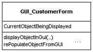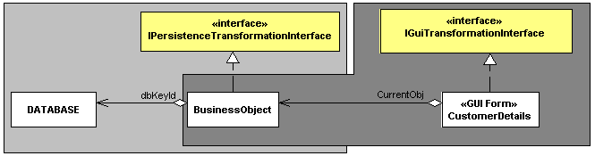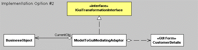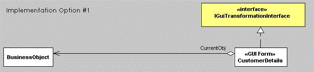 The "Presentation Layer" GUI Transformation Now we will implement the mirror transformational task of providing a GUI for a business object. The object or model is transformed to and from a human manipulable/editable format in a GUI (Graphical User Interface). Sample Implementation #1 - Put the transformational methods on the form class A common way to implement the GUI Transformation Interface is to add the required two methods and attribute to a GUI form class: