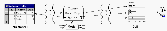 Forces involved in data-aware solutions Relational database-style data-aware controls are often compelling solutions, and may be all that is required in certain contexts, for example, where portability and transparency forces are weak, and you are only dealing with persistence to relational databases. However, one day you might be writing a stockmarket simulator in the Python language, which requires objects to be streamed to file, and requires the complex display of objects in a Java swing GUI under Linux and then later requires you to re-implement the display of those same objects in a Delphi GUI form under Windows. In this example, the forces of adaptibility and control are strong, and the data-aware force is weak and thus traditional data-aware controls are not going to adequately resolve the forces. Another major issue with data-aware controls is that in such frameworks, database tables, not objects are first class citizens - you dont even need to define classes to use data-aware frameworks (but of course you need to define your tables). This complicates the task of an object oriented developer who wants to model his or her domain by defining classes with both attributes and behaviour, and wants to make these classes first class citizens within their overall design. Ironically the developer usually proceeds by demoting the relational database to a mere storage facility and is forced to implement a persistence layer which transforms (loads/saves) the objects in memory to rows in tables. Data aware controls could still conceivably be used, as long as all relevant objects are persisted to disk immediately before the data aware GUI form is invoked. SolutionDefine an interface featuring a pair of transformational methods. One method converts the attributes of an object into the foreign format. The second method converts the foreign format back into attributes of the object. Maintain a reference (e.g. pointer or integer) to the other format in either the original object or the transformed object (e.g. a domain object in memory might store an integer ID reference of the record in a table that persists that domain object). The two methods of the class implementing the Transformation Interface will contain all the (possibly detailed) mapping code required to transform an object into another format.