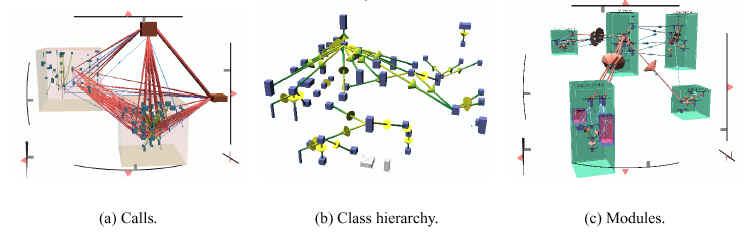 Delphi 6 is starting to represent this sort of hitherto 'hidden' and unvisualised information visually - both data diagrams and now the form designer have an extra tab, which lets you view your components schematically and see the wiring between them. Relevant to visualisation is how you make the wirings. It is worth noting that rather than dragging lines between components in order to wire them older version of Delphi have always provided helpful combo boxes on all components to allow designers to quickly make wirings between components. For example, certain component properties are settable at design time. The programmer selects an object from the combo box in order to make the wiring (ie. set the property). The combobox for each property lists all the components on the enclosing form that the property could possibly point / be wired to. Software VisualisationThere seems to be some serious work being done in this field. Check out Software Visualization in Prolog by Calum A. McK. Grant (as a Dissertation submitted for the degree of Doctor of Philosophy) which has astonishing pictures of software visualisation tools and visual programming systems e.g.