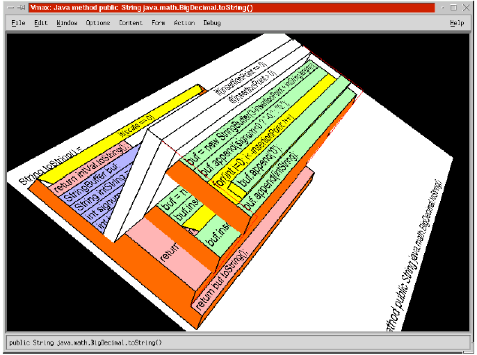 This page explores novel ways of visualising software design and of watching software execute. The "world of cells" metaphorFor example, imagine your running software as a body of cells, each cell representing an instance of a class. Each object / cell lives in a community of objects, sending messages to other objects, storing data and providing behaviour exposed as methods. ![]() OO software as biological cells Like in UML, the top half of the cells are storage (primitive data including pointers to other cells) and the bottom half represents the available public methods of the object. The red lighting symbol Imagine being able to pan around and view different aspects of this running software model. The technique used by the information organiser the brain might be one cool way to browsing, navigate and perhaps organise such "computational space". Animating UMLThere is a UML animation system called Rhapsody - you can watch your UML actually execute -they call it "executable UML-based application development". Though I haven't actually see it run (gotta pay money for that privilege). I'd be interested to see how they handle sequence diagrams, since sequence diagrams are not syntactically expressive enough to precisely model for loops and if statements to a practical, executable level. Debuggers as visualisersOf course debuggers are the most obvious tools we have today for watching software execute. We can watch variables and see the current execution point etc. There is a java visualisation debugger that is amazing when watching multiple threads. The python for windows debugger is pretty amazing too. You can drill inside namespaces, objects and classes ad-infinitum. Even methods are objects, which have properties. Its not animation but its an interesting hierarchical visualisation of computational space and name space. P.S. What sort of interesting "spaces" are there in software? The Jbuilder 2 Bible by Armstrong has some fantastic descriptions of how software and objects operate and interact. Visualisations using gui componentsIn my old Multimedia Toolbook programming days, if I was prototyping an application and I needed a datastructure to hold a list of strings, and if that data was something I might want to watch change during program execution then I would use a visual GUI component to hold that data. This way I could always 'see the data' and watch it change. After development I simple made the GUI elements (that would make no sense to the user) invisible but still operational. Normally a programmer would choose a non visual datastructure, which would of course be many times more efficient than storing the data in a GUI component. It is also considered bad practice to couple your 'model' with GUI. However for prototyping, the advantages are instant and often beautiful visualisations, since you can also change the fonts, colors and placement of such GUI elements to produce pleasing visualisation layouts. Note: this technique of using gui components as data structures is just a thought provoking idea of how to achieve visualisation of program innards and program behaviour. I am not advocating that you build your serious programs in this way. Static representaion of "wiring"I also like the Visual Age for Java technology, the way you can draw links between components. UML doesn't cover this sort of 'real world' representation of the wiring between GUI components on a form and objects in your model/application. Check out a tutorial on how Visual Age uses the wiring paradigm.