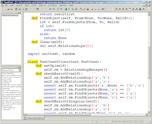 Textpad is not a bad editor to use with python. You can edit with syntax highlighting. You can install ctags and view classes and methods inside those classes. You can launch both python and jython from within textpad. You can double click on errors and jump to the offending line in your python source. However to set all this up you need to follow the following instructions: Syntax highlightingThere are numerous python syntax highlighters listed at the textpad add-ins site. I use the one by Noah Spurrier <noah@noah.org> and Jim Jinkins <j-jinkins@usa.net>, but have customised it so that class and def methods appear in reverse yellow video. My own favourite and customised version of a python syntax highlighter for textpad. Put this in your c:\program files\Textpad 4\system directory. Also you need to follow the installation instructions for creating a python document class that textpad will know about. Things look like this: