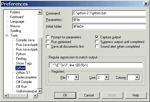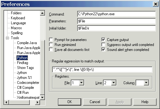 Double click on errors and jump to the offending line in your python sourcePut the following expression into the configuration sections, as pictured above. ^.*"\([^"]+\)", line \([0-9]+\) Installing ctagsSee http://www.textpad.com/add-ons/index.html